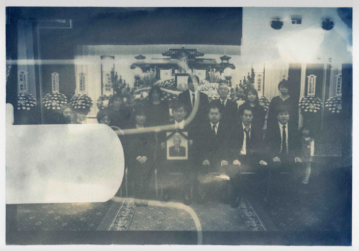 祖父の写真を遺品とともに現像したサイアノタイプ。祖父は原爆の閃光によって火傷を負い、やりたいこともあったろうに、数年のあいだ寝たきりになった。そののち回復して80年近く生きたわけであるが、被爆者とカテゴリーすることで、その人生が不幸であったと私は言いたくない。祖父の人生に原爆は不要であったことは言うに及ばないが、その一点で彼の人生そのものを否定しないでほしい。そこで本作は、祖父が被爆した場所に赴き、爆心地の方向に登る八月の太陽の光によって感光した。その後の思い出を温かい太陽の光に浴びせることで、光の意味を反転させたいという試みである。